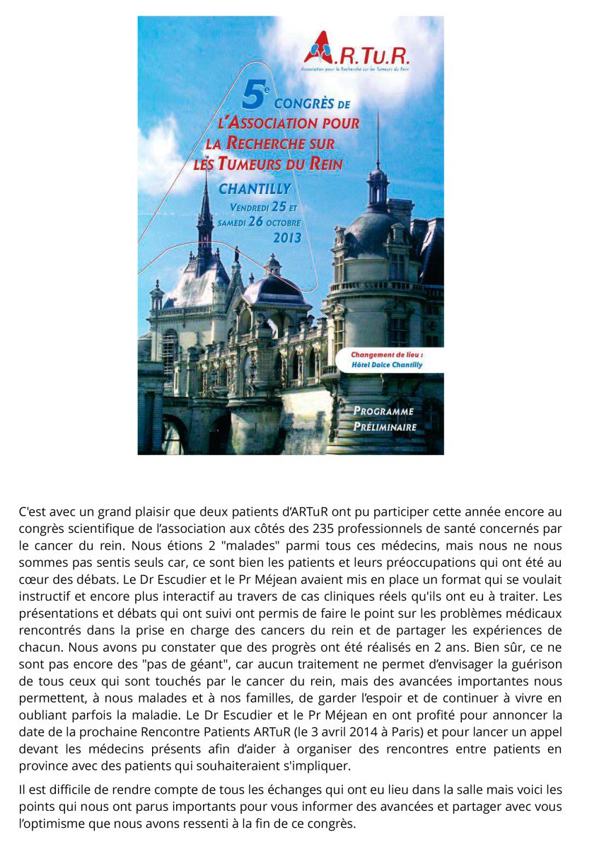 Depuis 2005, un congrès scientifique réservé aux professionnels de la santé, est organisé tous les deux ans à Chantilly par les membres de l'association ARTuR et grâce aux partenaires d'ARTuR.